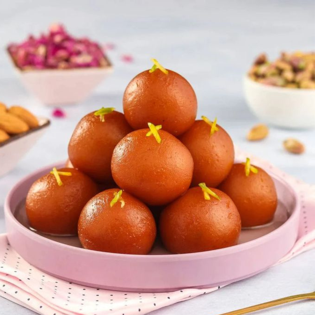 Desi Ghee Gulab Jamun is a luxurious Indian dessert made from soft, melt-in-your-mouth khoya (milk solids) balls that are deep-fried to golden perfection in pure desi ghee and then soaked in a fragrant sugar syrup infused with cardamom and rose water.