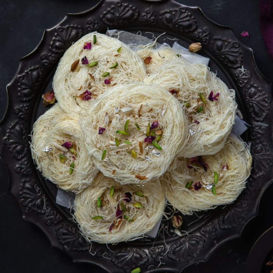 Fenni is a delicate, melt-in-the-mouth sweet made from fine, vermicelli-like strands, usually fried and topped with powdered sugar, cardamom, and a sprinkle of dry fruits.