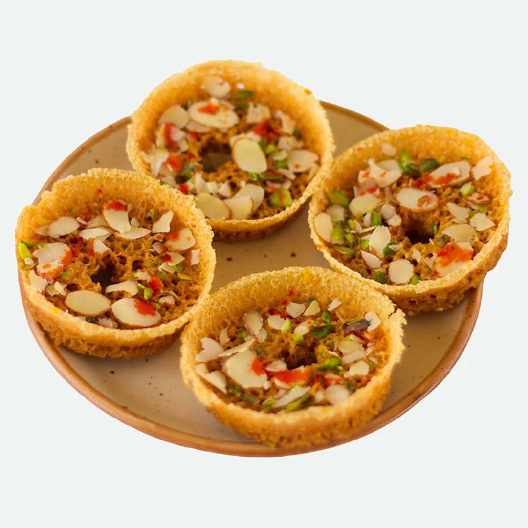 Mini Ghevar is a tiny treasure of Rajasthani sweetness—crispy, golden, and soaked in rich saffron-kissed syrup.