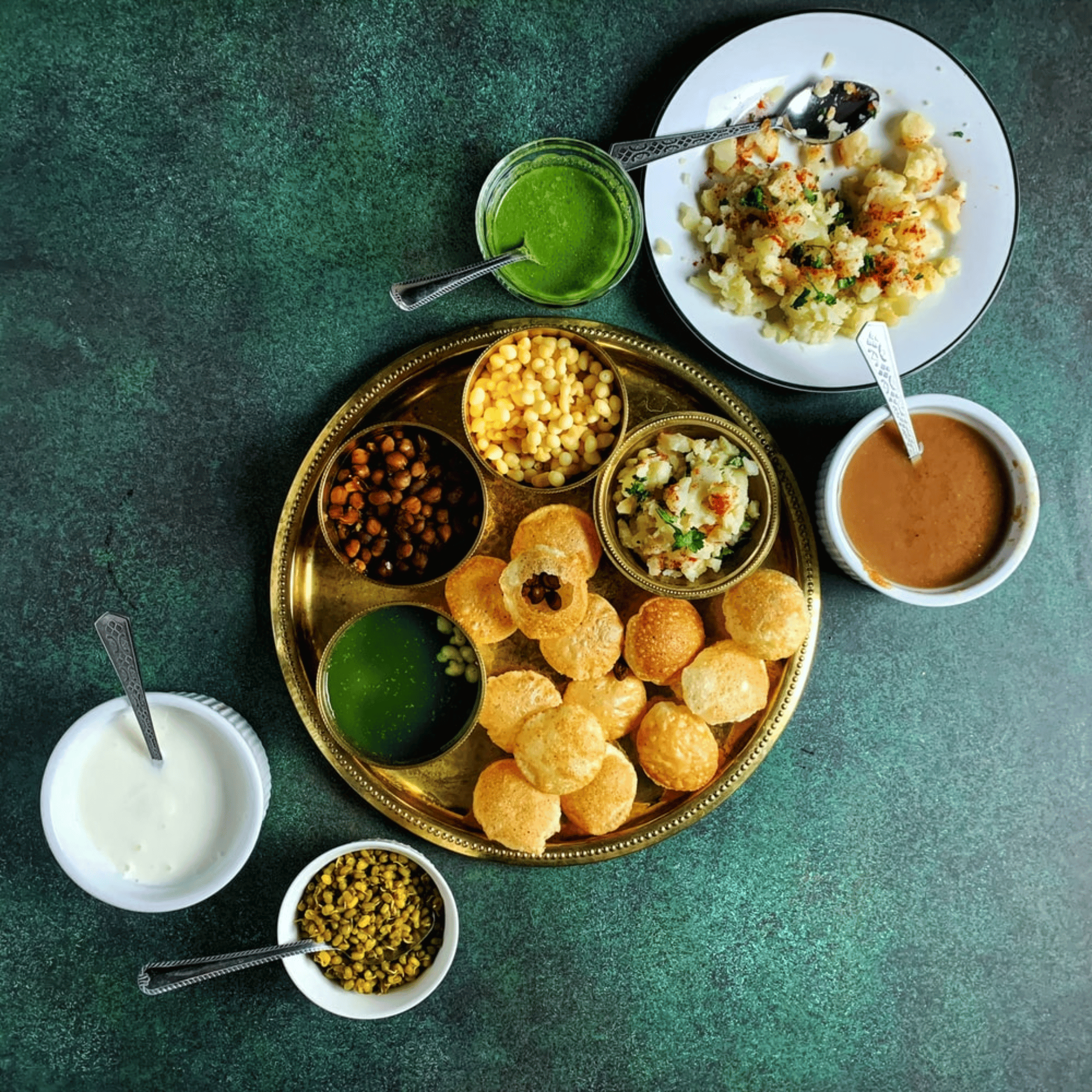 Gangaur Sweets Pani Puri features crispy puris filled with spicy tamarind water, potatoes, and chickpeas, offering a burst of tangy, savory flavor.