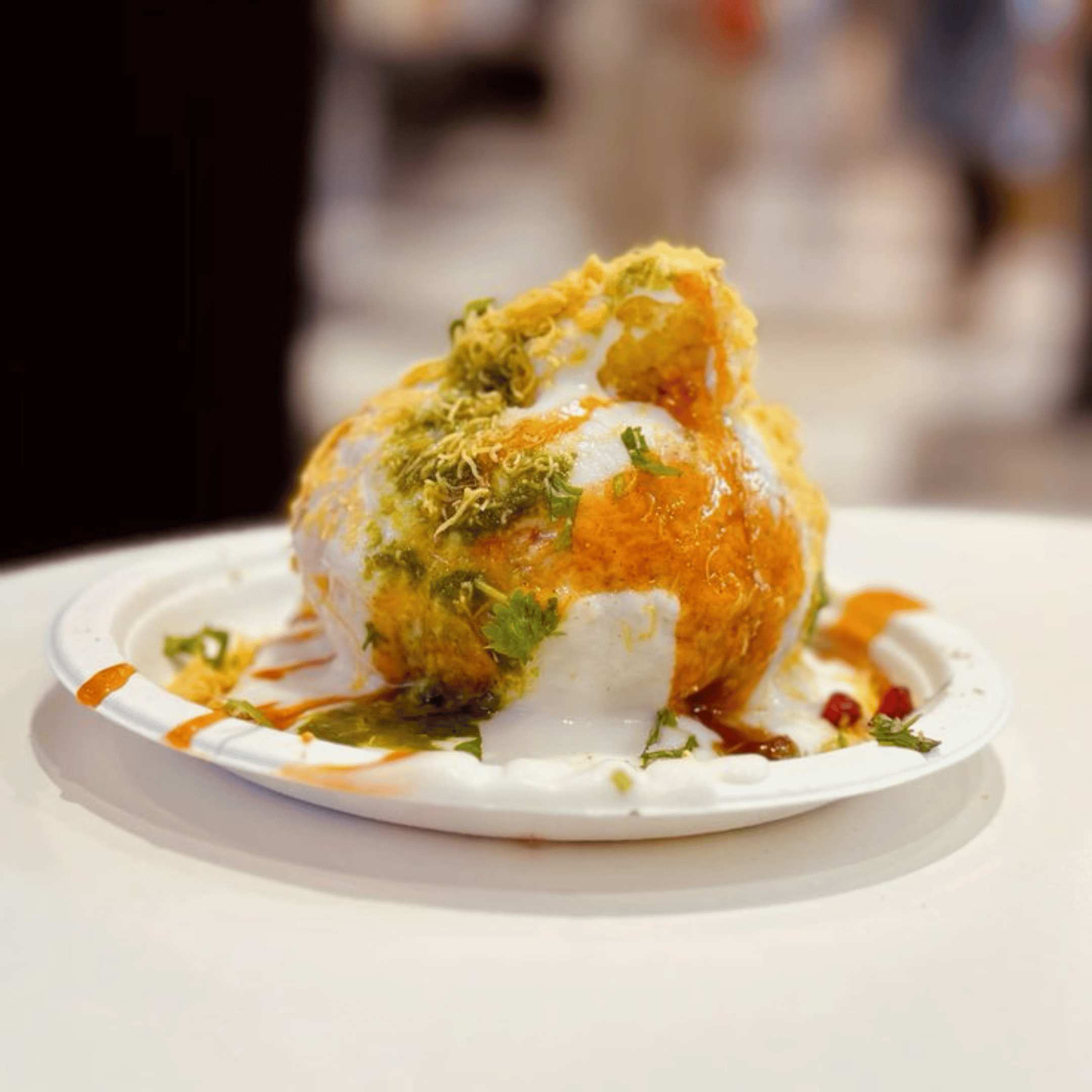Gangaur Sweets Raj Kachori is a large, crispy puri filled with spiced potatoes, yogurt, chutneys, and sev, offering a rich, flavorful experience.